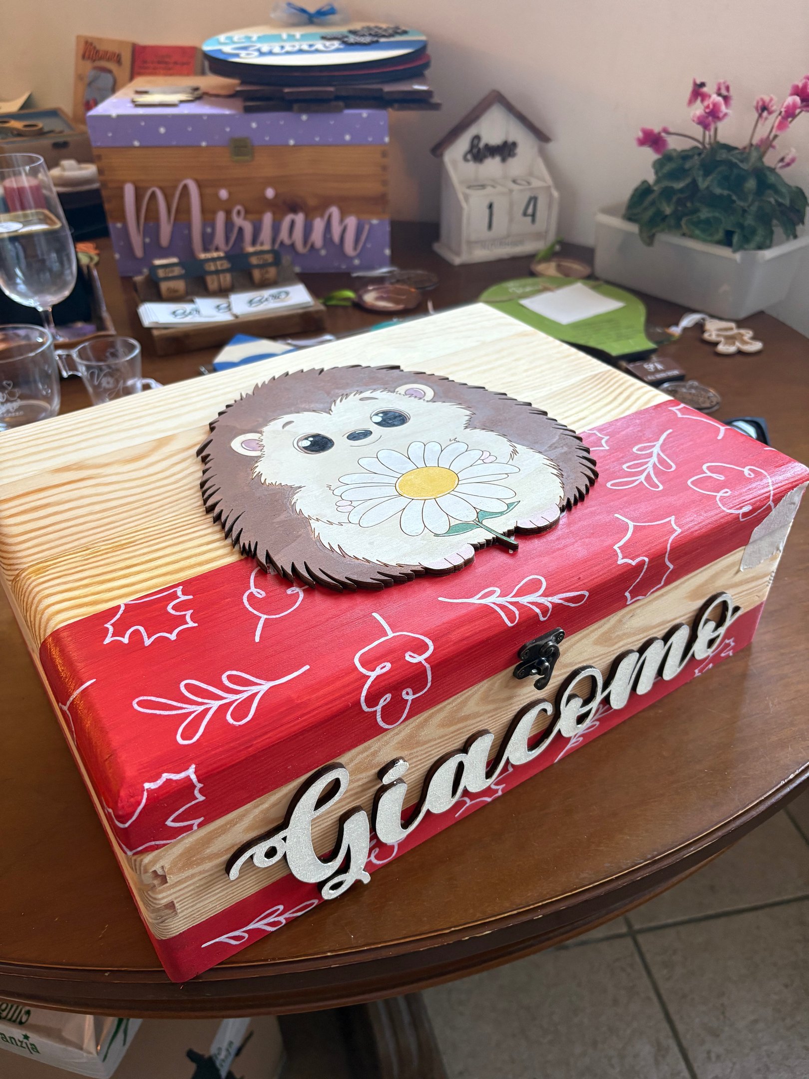 La base è realizzata in legno di pino, le sagome dei vari soggetti sono tagliate a laser e dipinte a mano.